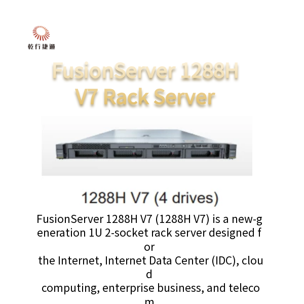 FusionServer 1288H V7 (1288H V7) is a new-generation 1U 2-socket rack server designed for the Internet, Internet Data Center (IDC), cloud computing, enterprise business, and telecom. It is also ideal for IT core services, virtualization, scientific computing, distributed storage, and other complex workloads. The 1288H V7 features low power consumption, high scalability and reliability, easy deployment, and simplified management.